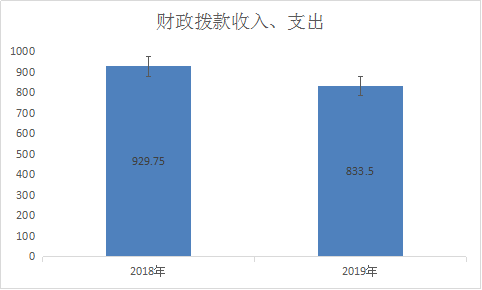 2 019年度收、支总计833.50万元。与2018年相比,收、支总计各增加(减少) -96.25万元,增长(下降) -10.35%,主要原因是工资福利支出政策性调整,人员调整和厉行勤俭节约。