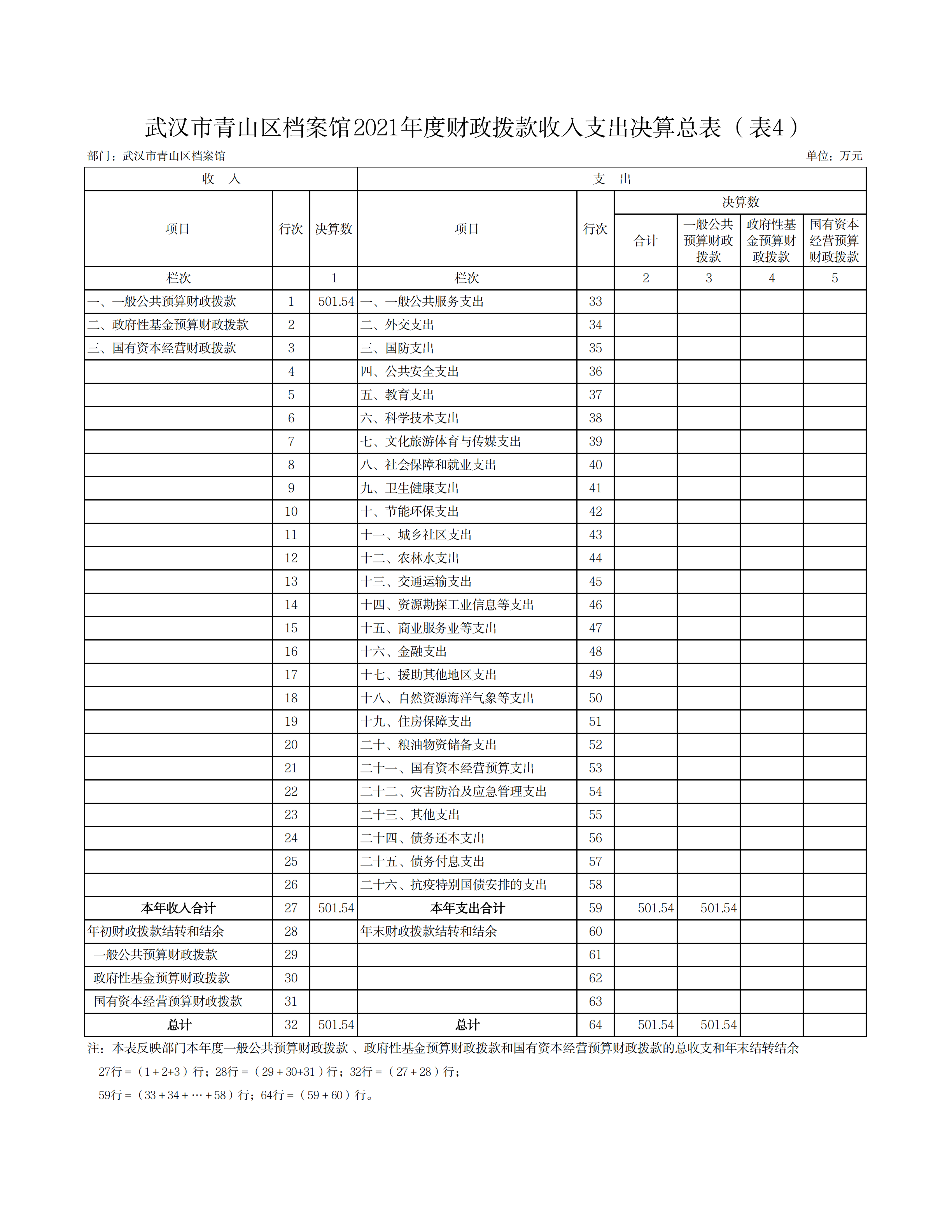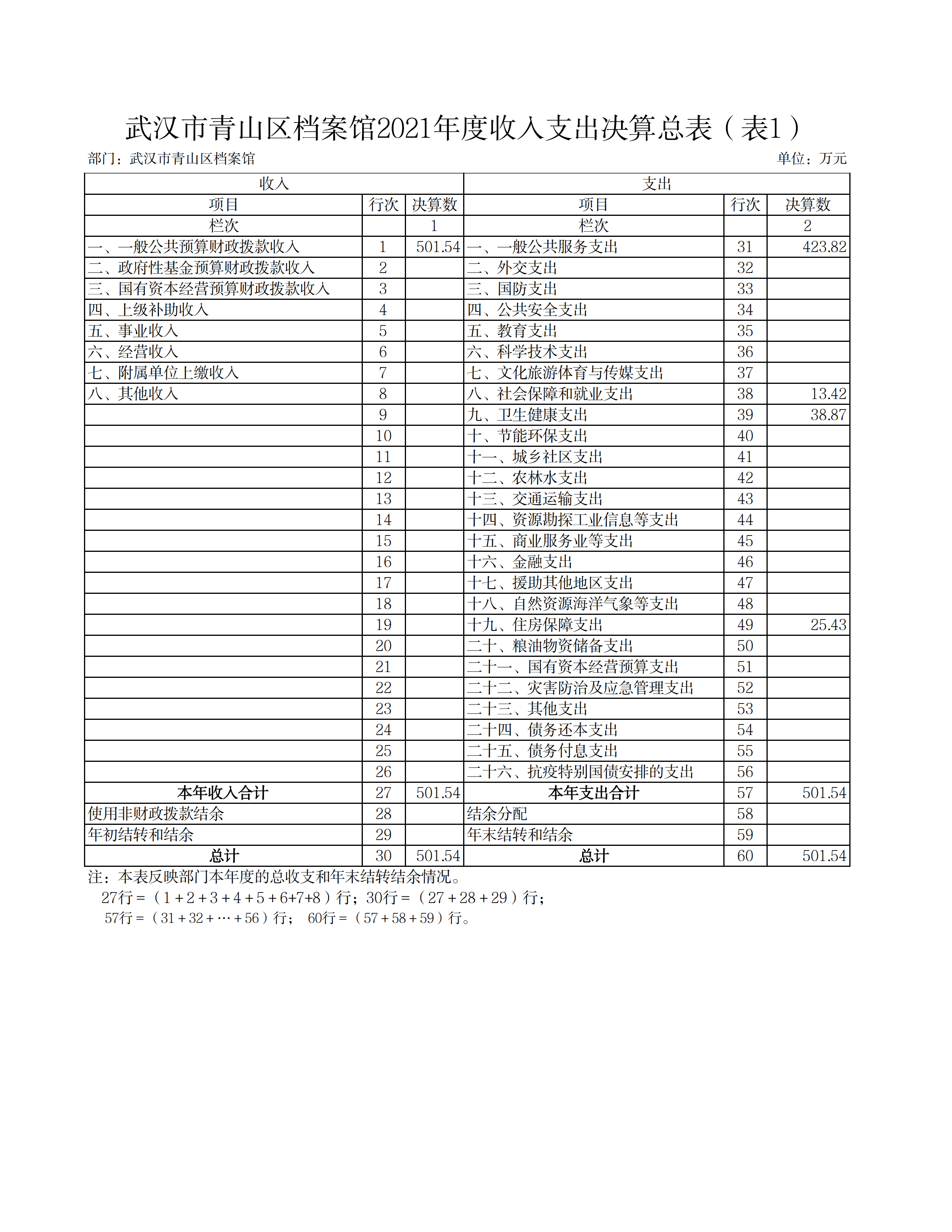 2021年度收、支总计501.54万元。与2020年度相比,收、支总计各减少196.39万元,下降28.14%,主要原因一是1名在职人员到龄退休;二是2020年因业务评查和疫情原因,增加了业务评查经费及疫情档案整理经费。