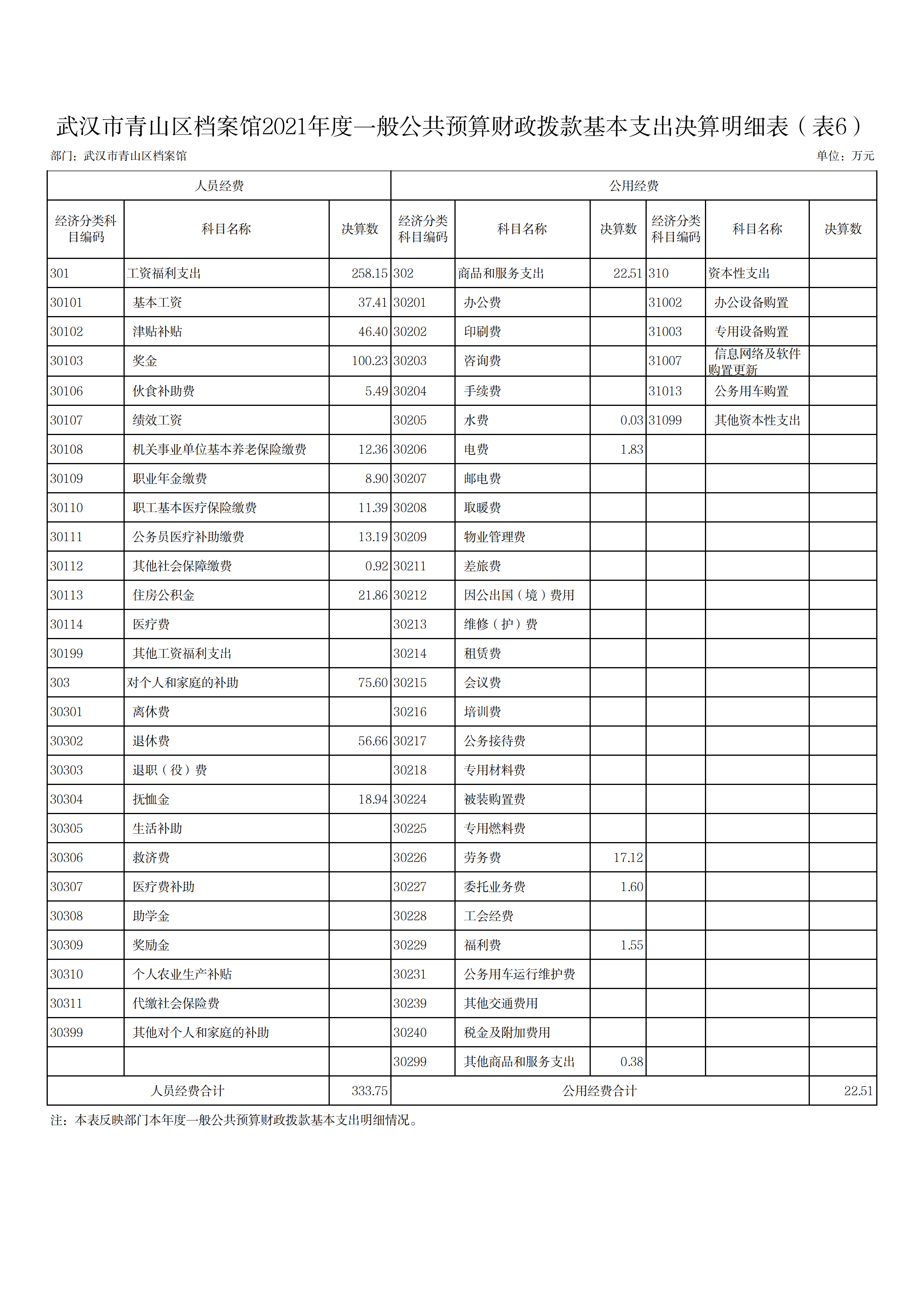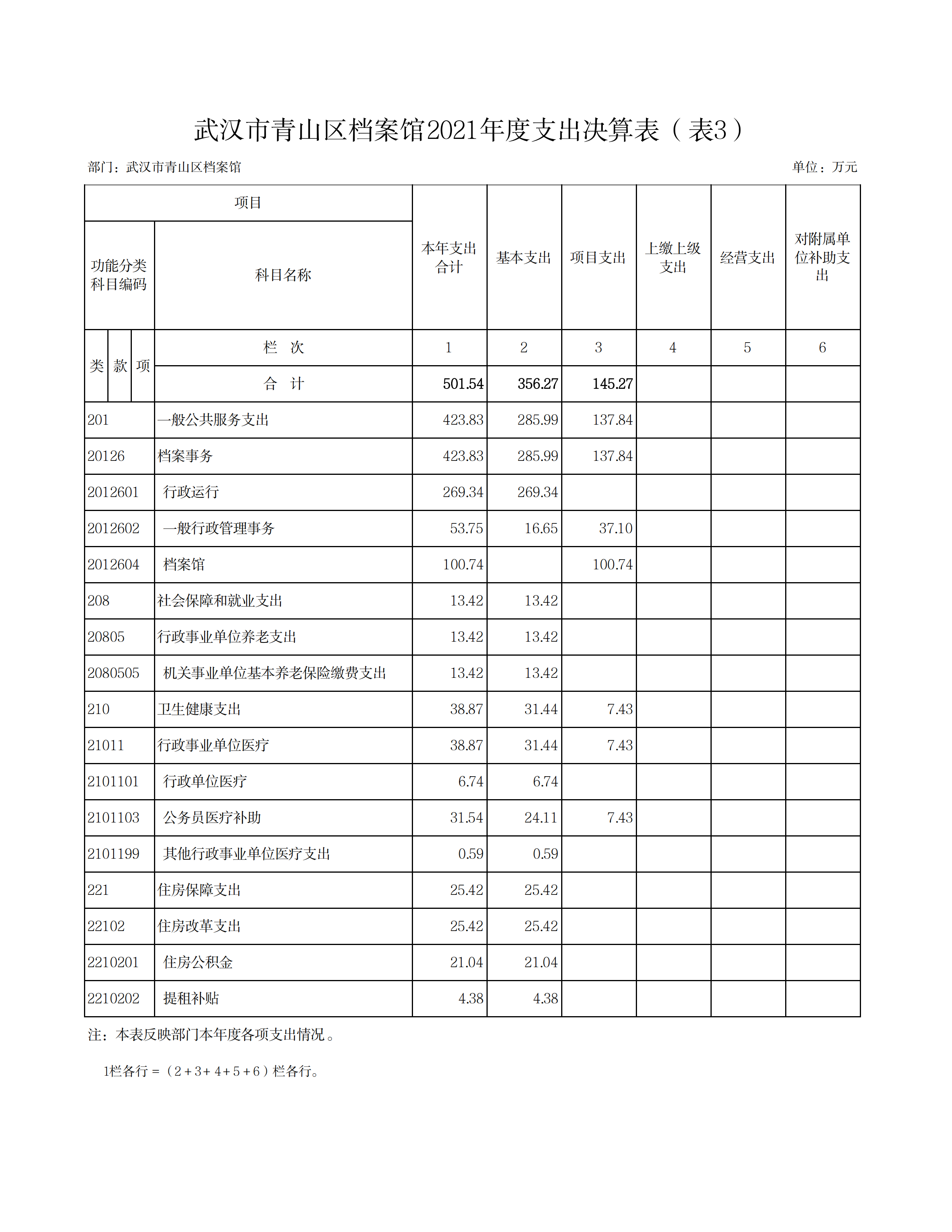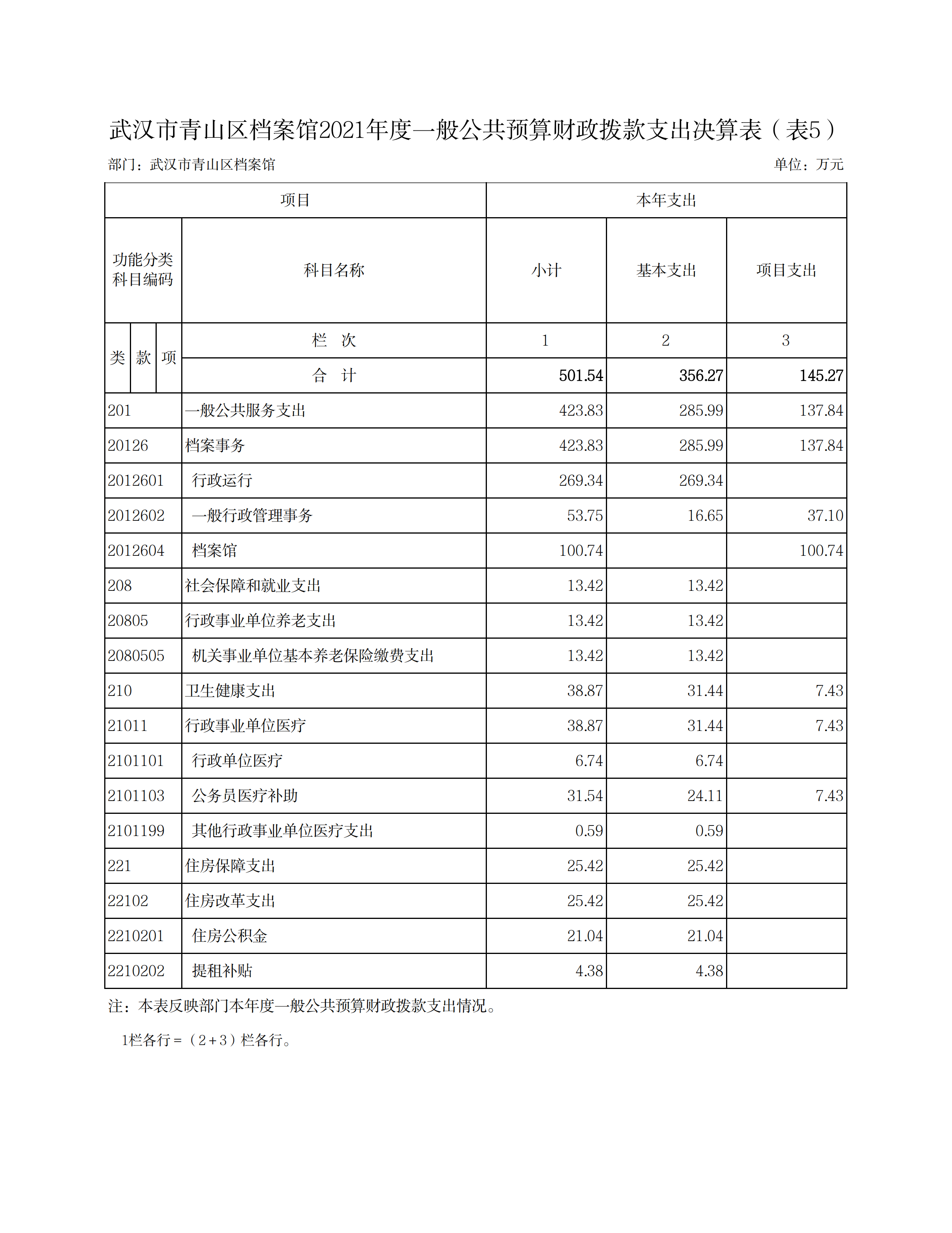 2021年度一般公共预算财政拨款支出年初预算为442.76万元,支出决算为501.54万元,完成年初预算的113.28%。其中:基本支出356.27万元,项目支出145.27万元。项目支出主要用于档案管理费100.74万元,主要用于档案接收、质检、管理,设备维护,系统运维,提供查询服务,档案编研、宣教等。编纂经费33.17万元,用于召开年鉴工作会议,布置年鉴编纂任务,开展业务培训,征集稿件。《青山年鉴》2021年卷于年底完成校稿、印刷、出版发行。《武汉年鉴》青山供稿及其他地情资料按上级进度完成;服务部退休人员(樊萍)统筹外经费1.99元,主要用于按月支付原档案馆二级单位文化用品服务部退休人员工资差额;老干工作部门专项款1.94万元,主要用于老干春节慰问及老干活动开支。卫生健康支出7.43万元,主要用于保障在职退休人员医疗补贴支出。