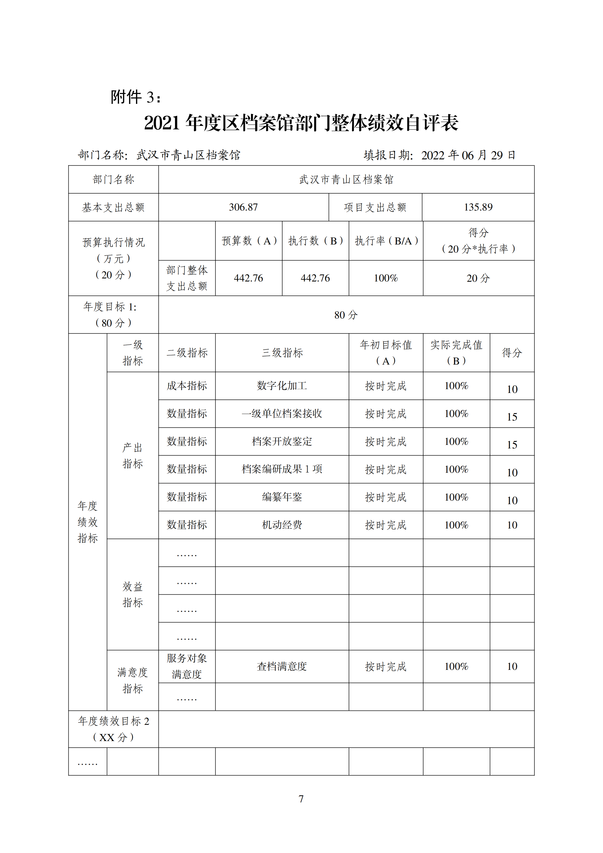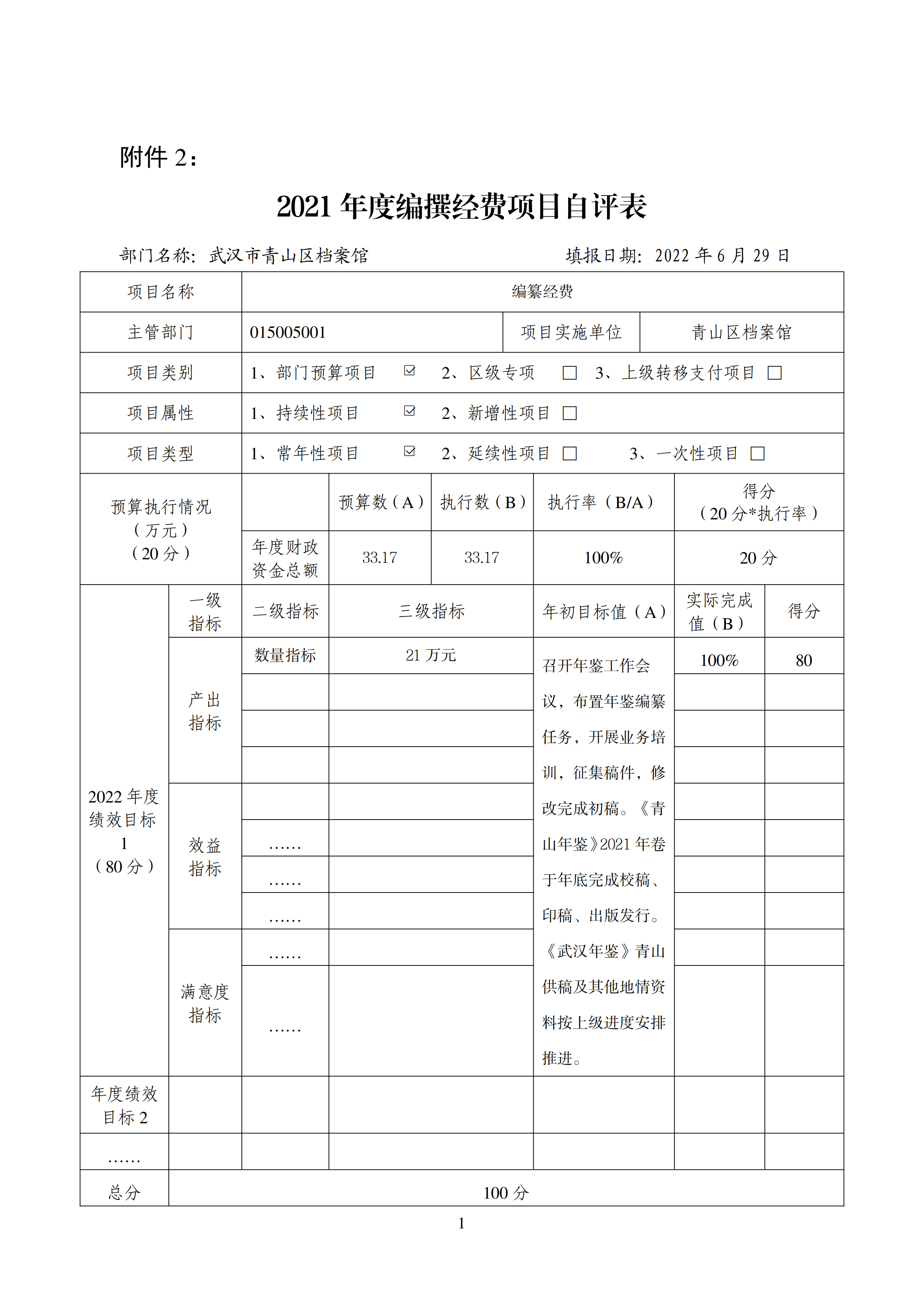 2.编纂经费项目绩效自评综述:项目全年预算数为33.17万元,执行数为33.17万元,完成预算的100%。主要产出和效益是:用于召开年鉴工作会议,布置年鉴编纂任务,开展业务培训,征集稿件。《青山年鉴》2021年卷于年底完成校稿、印刷、出版发行。《武汉年鉴》青山供稿及其他地情资料按上级进度完成。
