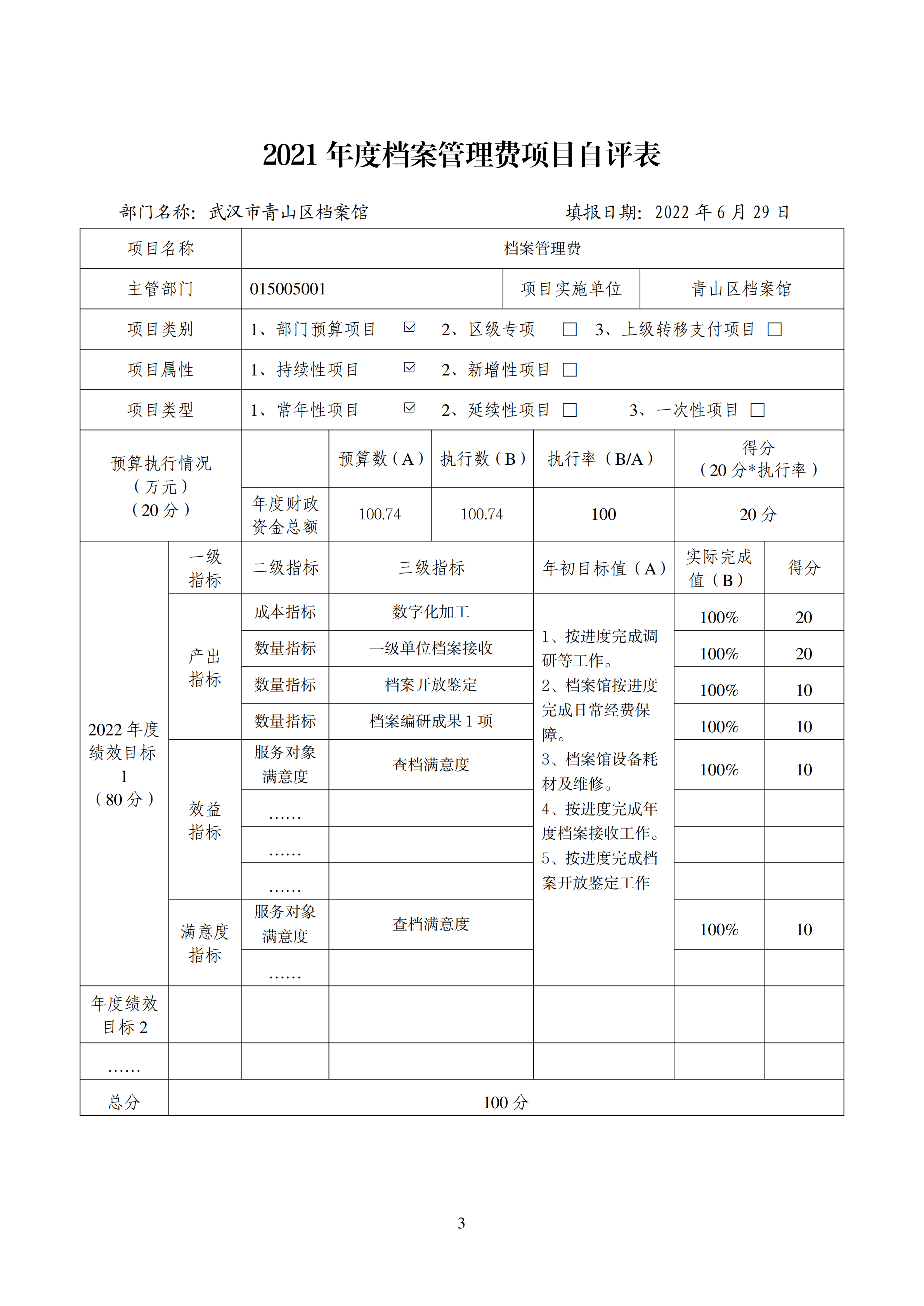 1.档案管理费项目绩效自评综述:项目全年预算数为100.74万元,执行数为100.74万元,完成预算的100%。主要产出和效益是:档案接收、质检、管理,设备维护,系统运维,提供查询服务,档案编研、宣教等。