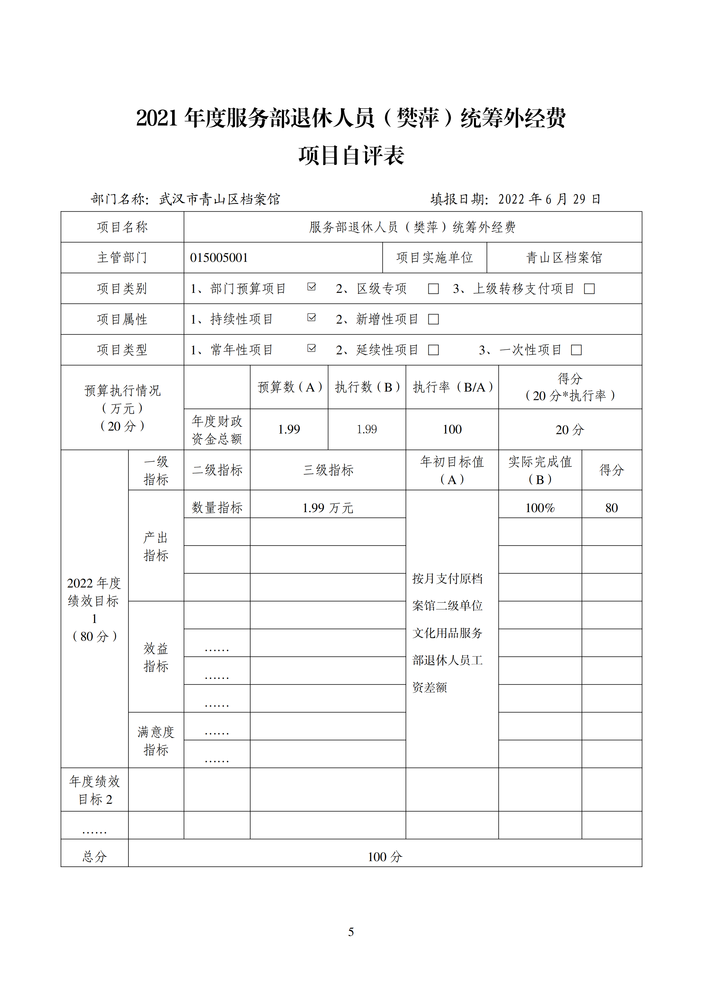 3.服务部退休人员(樊萍)统筹外经费项目绩效自评综述:项目全年预算数为1.99万元,执行数为1.99万元,完成预算的100%。主要产出和效益是:按月支付原档案馆二级单位文化用品服务部退休人员工资差额。
