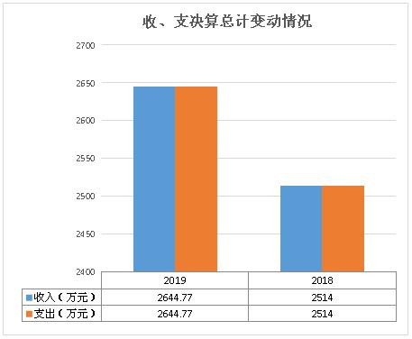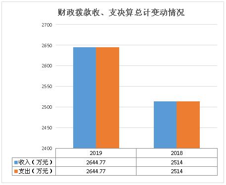 2019年度收、支总计2,644.77万元。与2018年相比,收、支总计各增加130.77万元,增长5.20%,主要原因是区公车平台置换了四台公务用车和综合楼运行维修改造项目比上年增多。