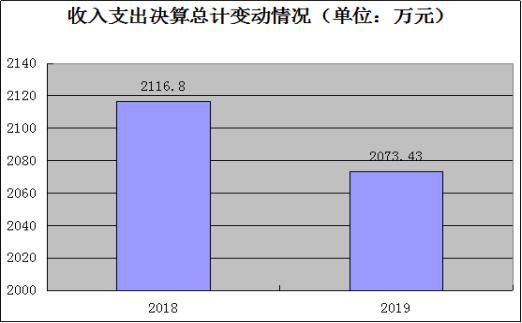 2019年度收、支总计2,073.43万元。与2018年相比,收、支总计各减少43.37万元,下降2.05%,主要原因是为贯彻落实中央、省、市过“紧日子”的决策部署,适当压减一般性财政支出。