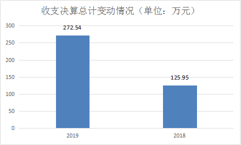 2019年度收、支总计272.54万元。与2018年相比,收、支总计各增加146.59万元,增长116.39%,主要原因是机构改革,部门职能增加,项目经费增加,年度收支增加。