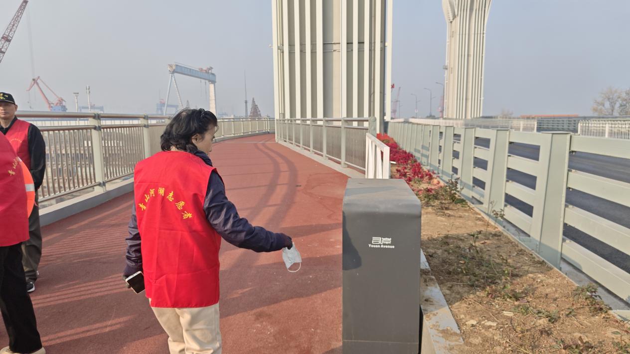 “请有序打卡,注意安全。”“桥面环境靠大家,垃圾不落地更美好。”志愿者们分工明确、配合有序:一部分驻守观景平台及人流密集区,引导市民文明游览、有序留影;另一部分则手持清洁工具,细致维护桥面及周边环境整洁。面对初次到访的游客,他们主动上前介绍周边景点、交通路线与便民设施,成为大桥上一道温暖而亮丽的风景线。
