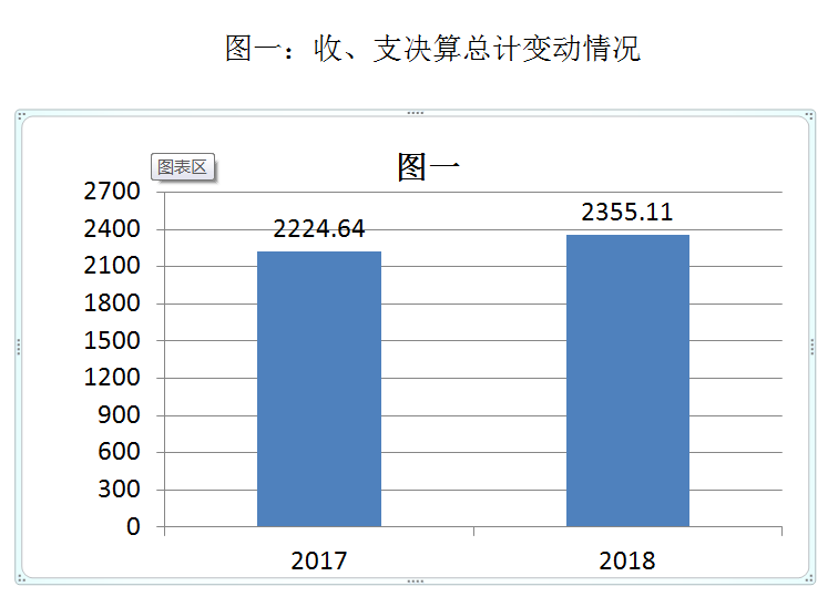 2018年度收、支总计2,355.11万元。与2017年相比,收、支总计各减少130.47万元,下降5.3%,主要原因是一般公共服务支出减少234.24万元、科学技术支出增加10万元、社会保障和就业支出增加185.99万元、医疗卫生与计划生育支出增加38.27万元、节能环保支出增加27.2万元、城乡社区支出减少177.61万元、农林水支出减少14.07万元、住房保障支出增加10.49万元、其他支出增加23.5万元。