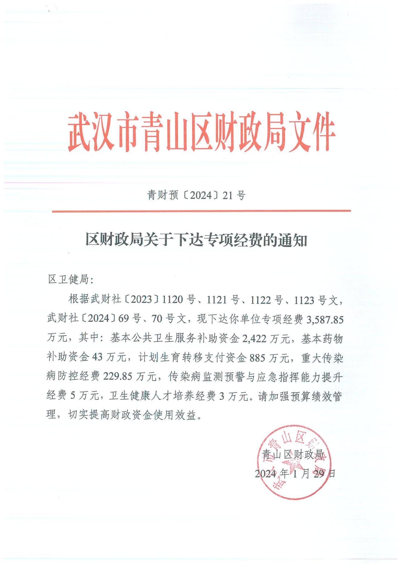 区财政局关于下达专项经费的通知 青财预〔2024〕21号