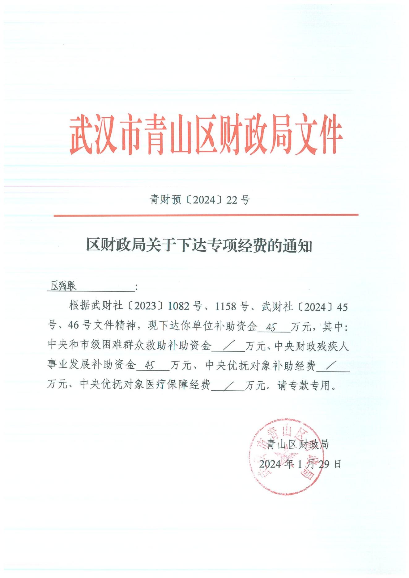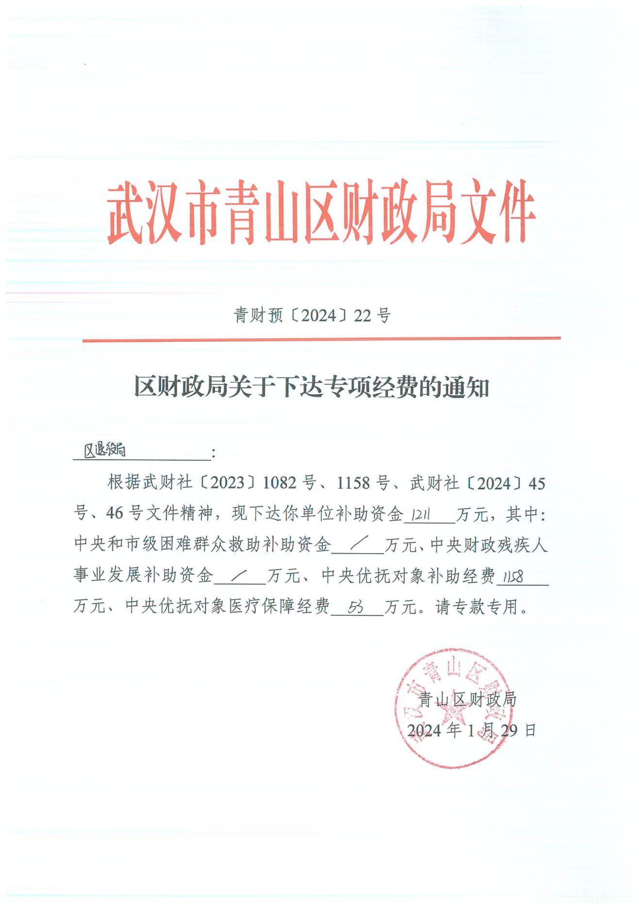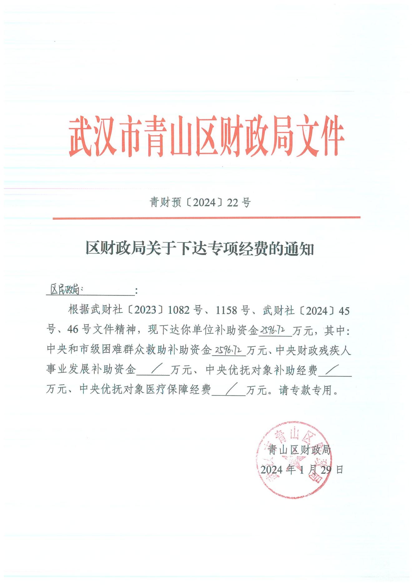 区财政局关于下达专项经费的通知 青财预〔2024〕22号