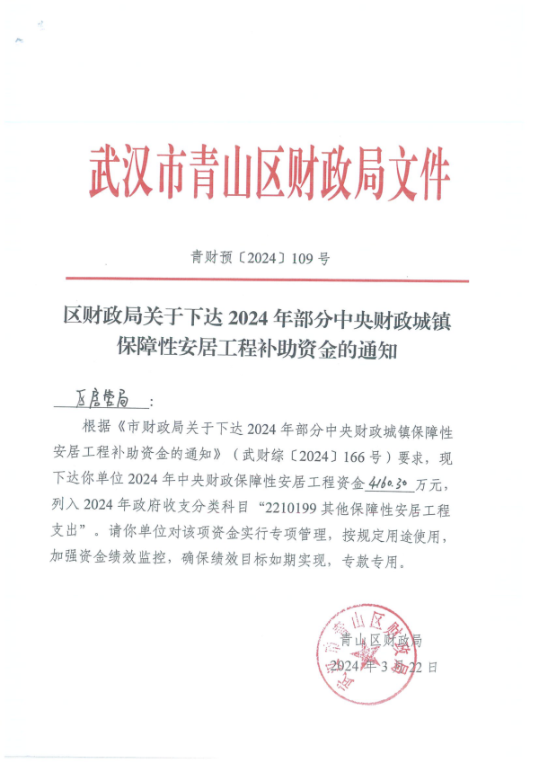 区财政局关于下达专项经费的通知 青财预〔2024〕109号