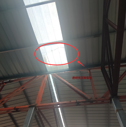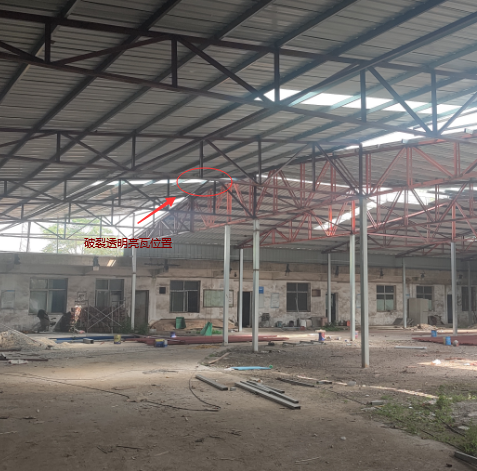 本次事故地点为八吉府街道胡漖村焦沙路6号内一钢结构工棚内(图1),出事位置为工棚屋顶一块透明亮瓦处(图2)。