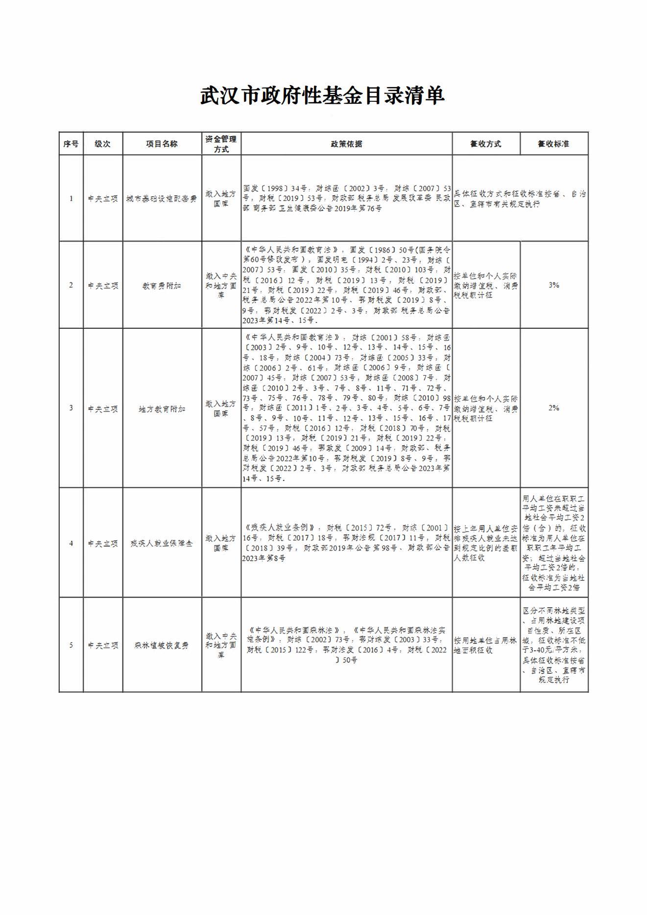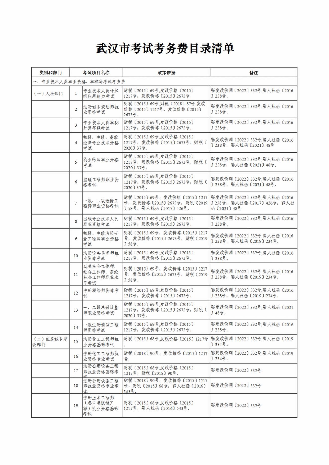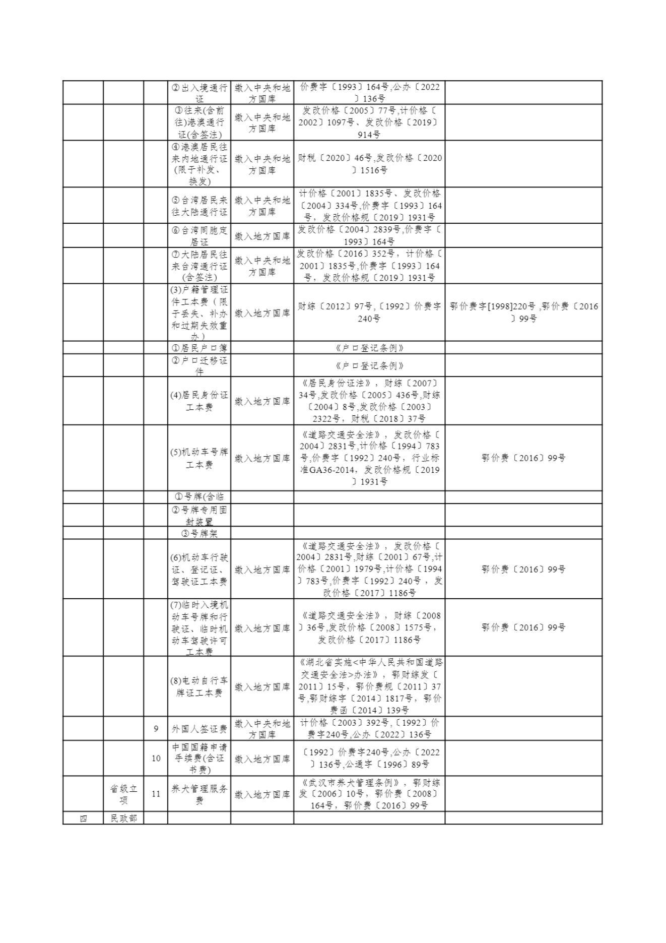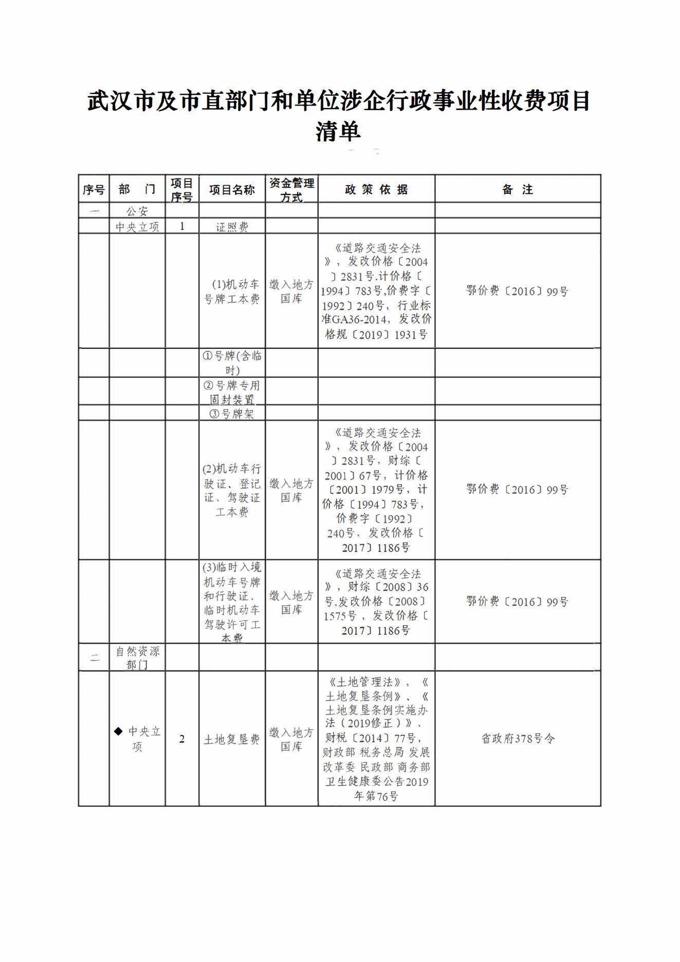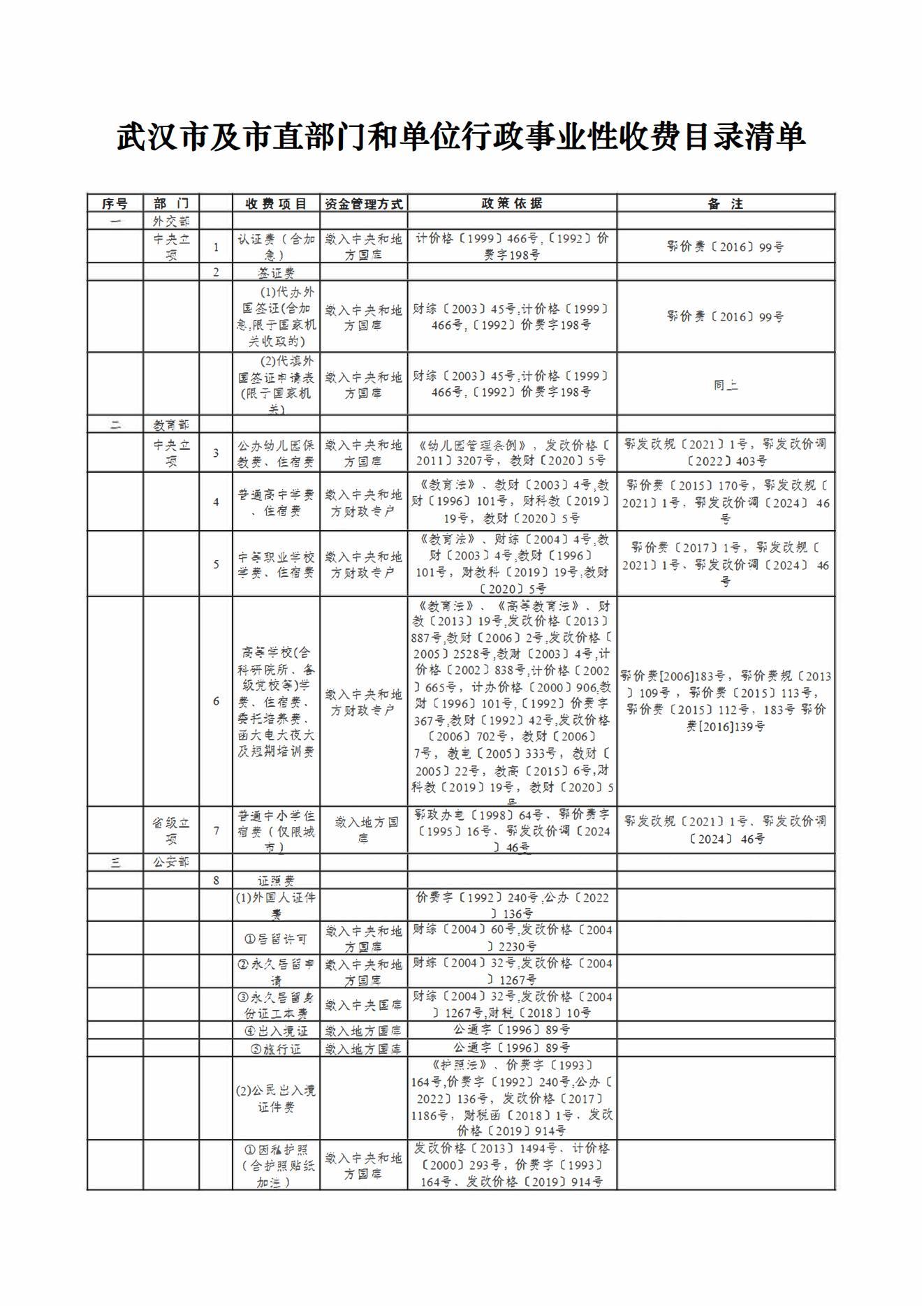 武汉市及市直部门和单位收费目录清单