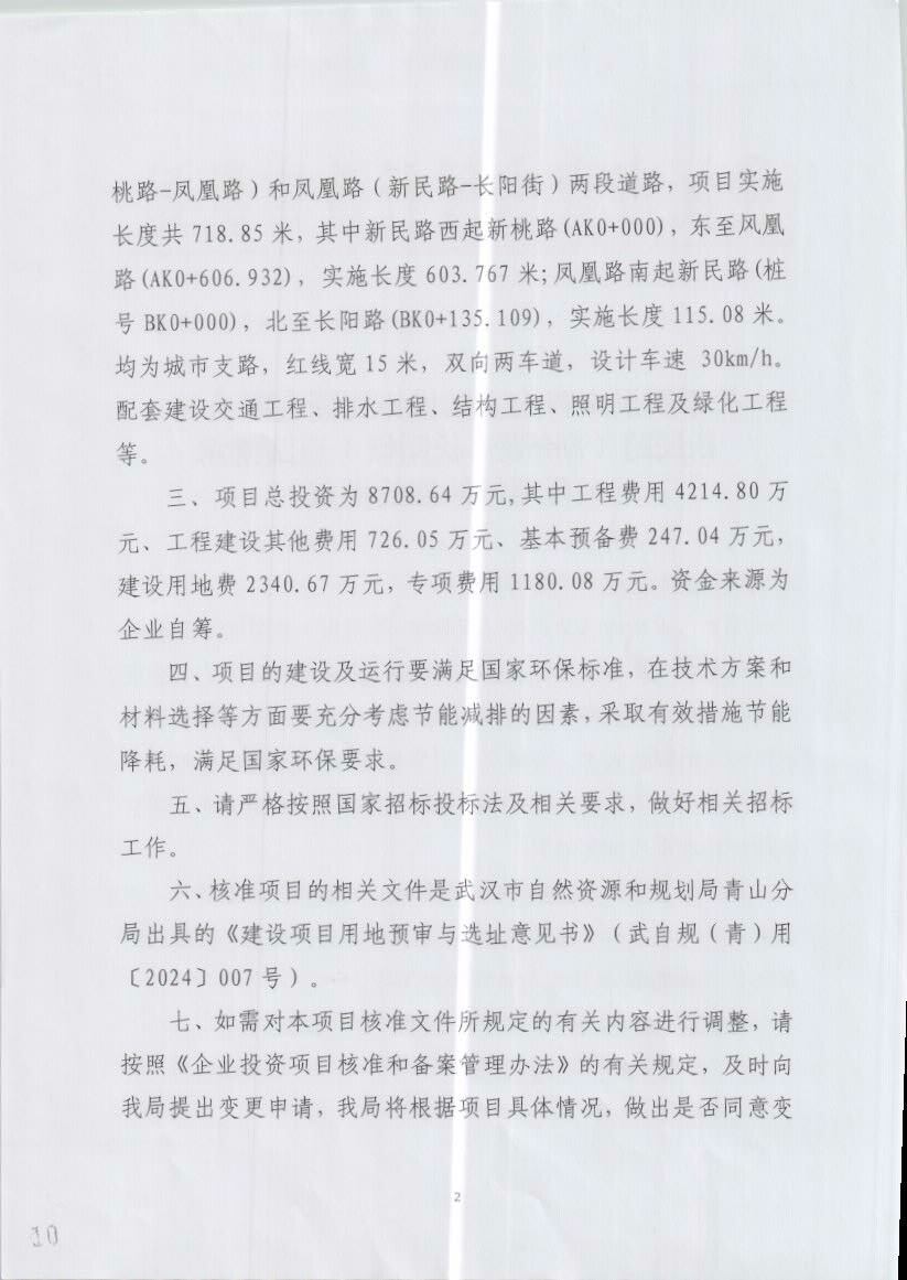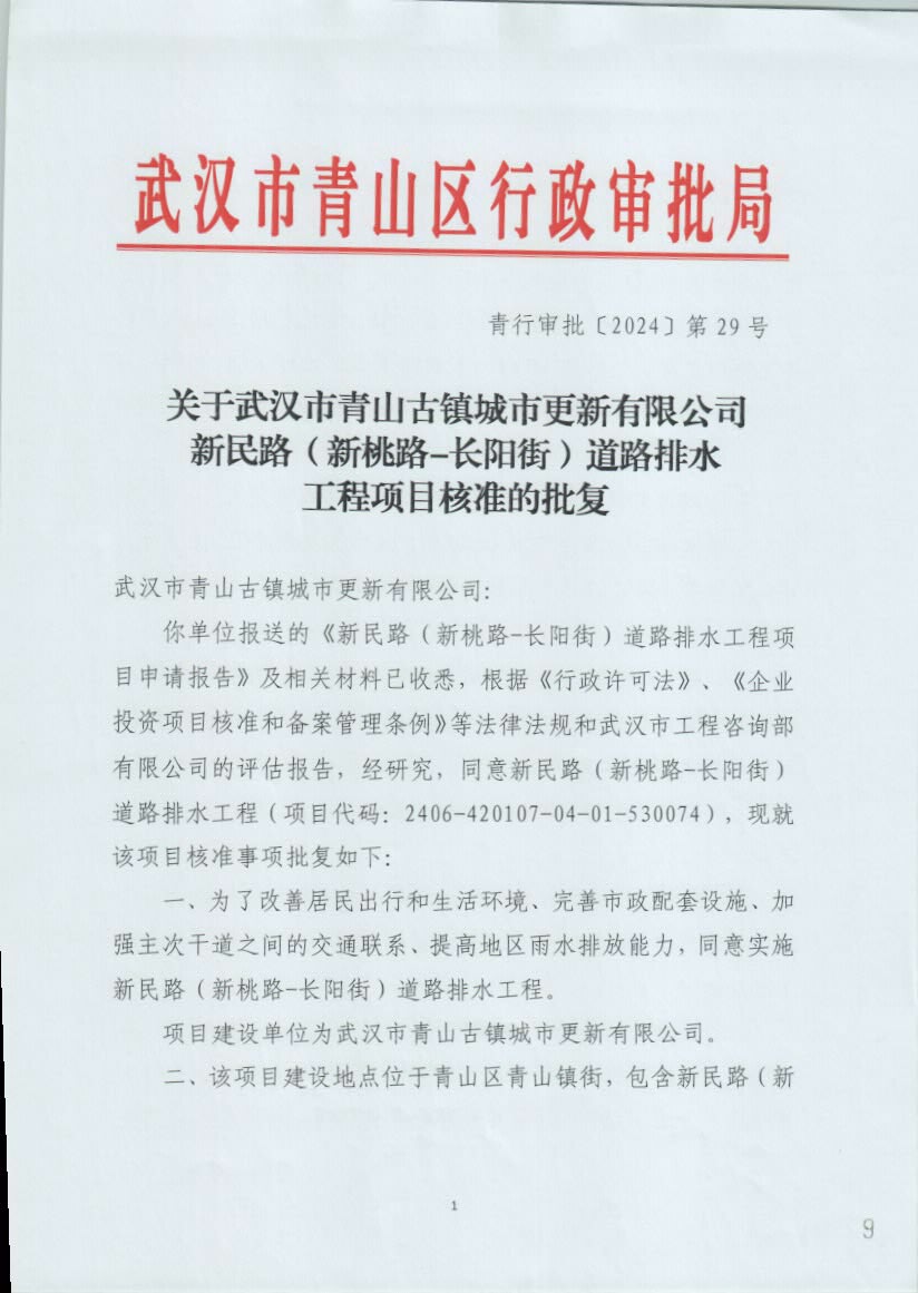关于武汉市青山古镇城市更新有限公司新民路(新桃路-长阳街)道路排水工程项目核准的批复