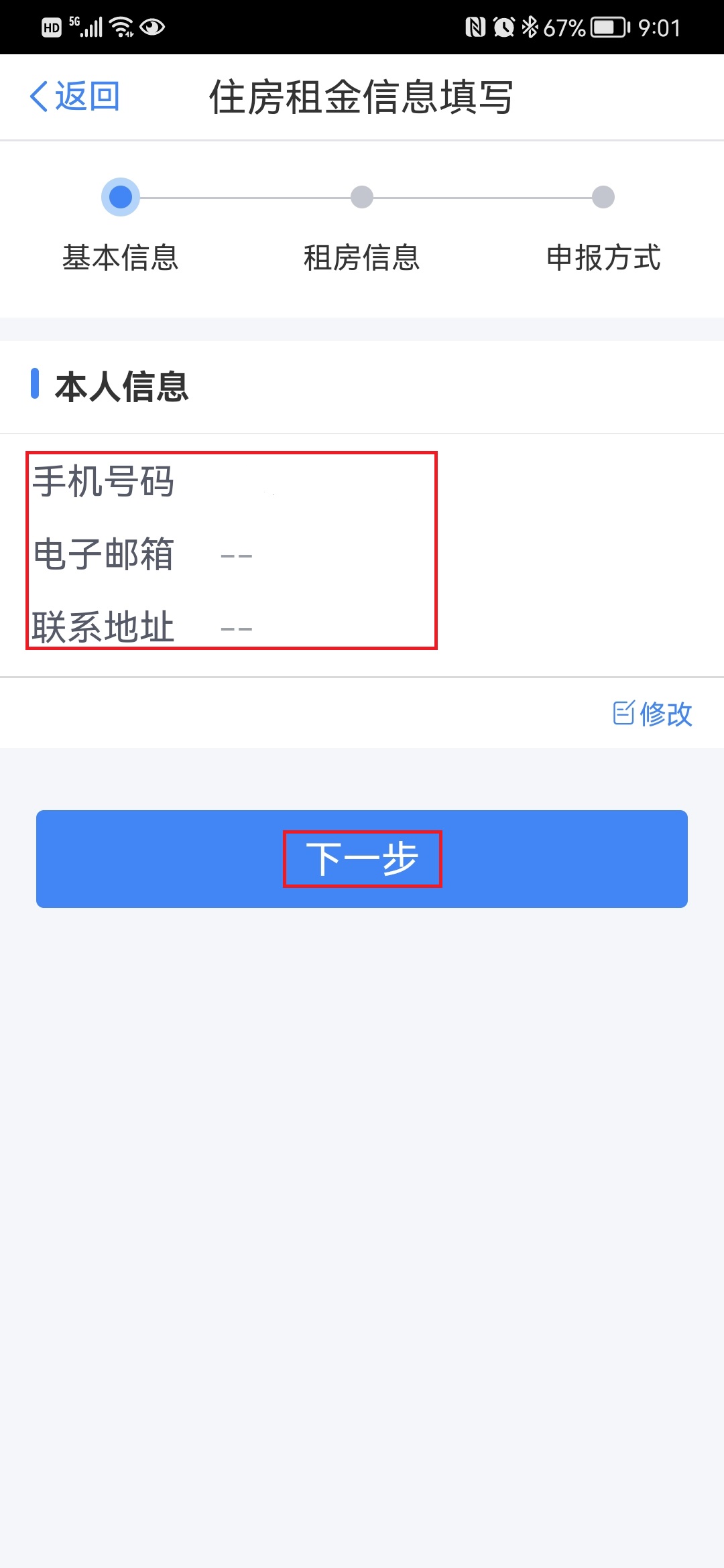 确认本人手机号码、电子邮箱、联系地址等基础信息,确认无误后点击下一步。