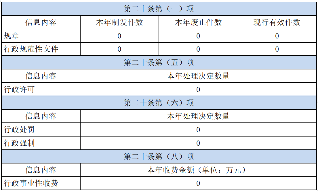 2023年,我局制发规章、行政规范性文件、行政许可、行政处罚、行政强制0件,行政事业性收费0元。