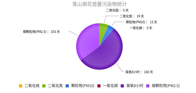 全年294个首要污染物统计天数中,首要污染物为臭氧(O3)160天,占55.4%;首要污染物为细颗粒物(PM2.5)103天,占35.6%;首要污染物为二氧化氮(NO2)19天,占6.6%,首要污染物为可吸入颗粒物(PM10)13天,占4.5%。(注:有1天同时有两个首要污染物。)