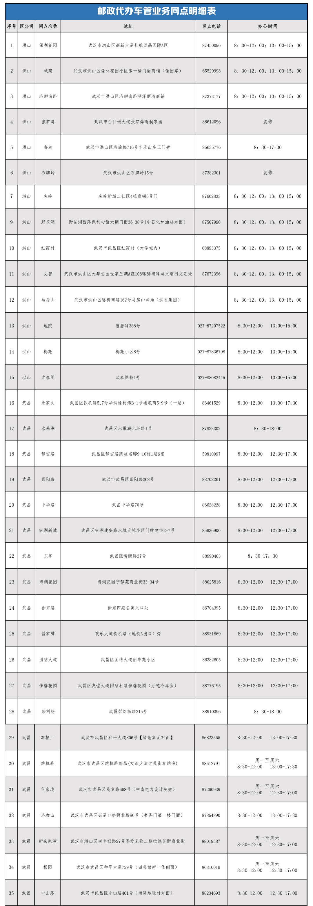 1、武汉市152个邮政网点。(滑动下方图片查看全部)