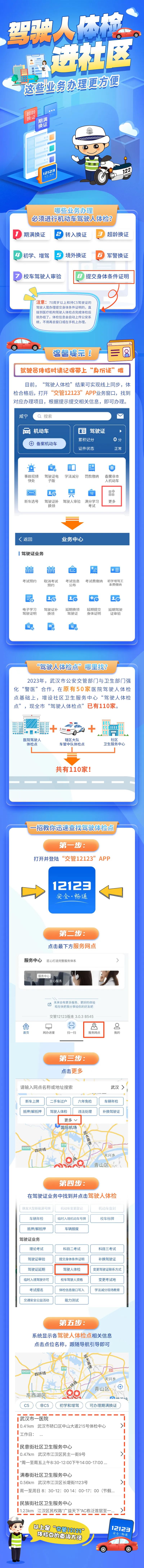 2023年,为进一步深化公安“放管服”改革,持续深入开展“我为群众办实事”主题实践活动,武汉市公安交管部门会同卫生部门进一步加强“警医”合作,在原有50家医院驾驶人体检点及部分辖区交通大队车管中队体检点的基础上,增设社区卫生服务中心“驾驶人体检业务便民服务窗口”,实现机动车驾驶人体检业务就近办理。最大限度减少群众往返次数、缩短等候时长、减轻群众负担,实现办理车驾管业务“网上办、马上办、就近办、一次办”的服务目标。