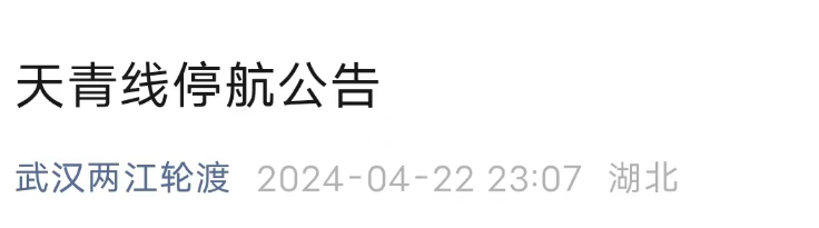 接武汉海事部门通知,天兴洲—青山航线自4月23日起,临时停航。不便之处,敬请谅解!