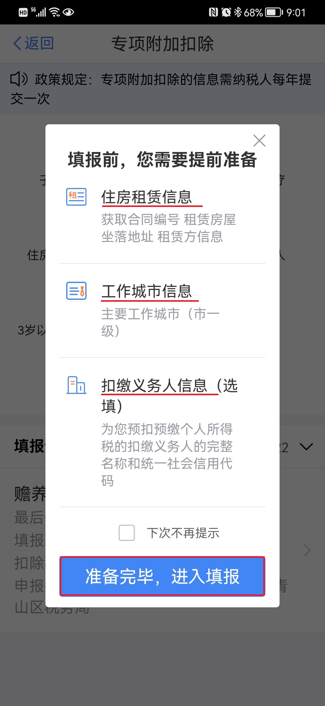 查看系统提示需要提前准备的资料,仔细阅读后,点击“准备完毕,进入填报”。