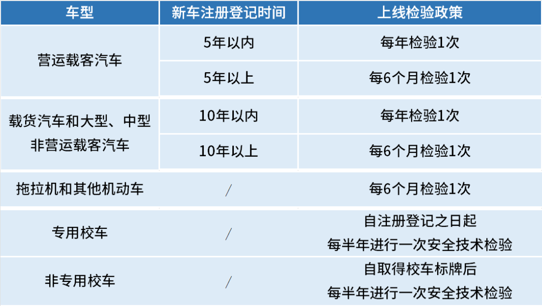 《中华人民共和国道路交通安全法实施条例》第六十二条 专用校车应当自注册登记之日起每半年进行一次安全技术检验,非专用校车应当自取得校车标牌后每半年进行一次安全技术检验。